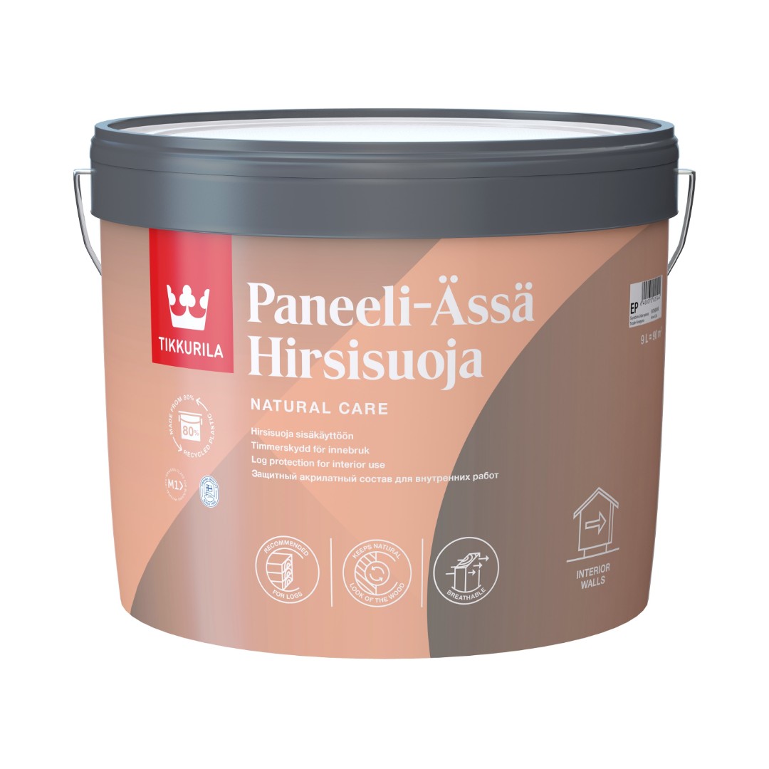 Водоразбавляемый полуматовый защитный состав на акрилатной основе TIKKURILA PANEELI ASSA HIRSISUOJA для внутренних работ.