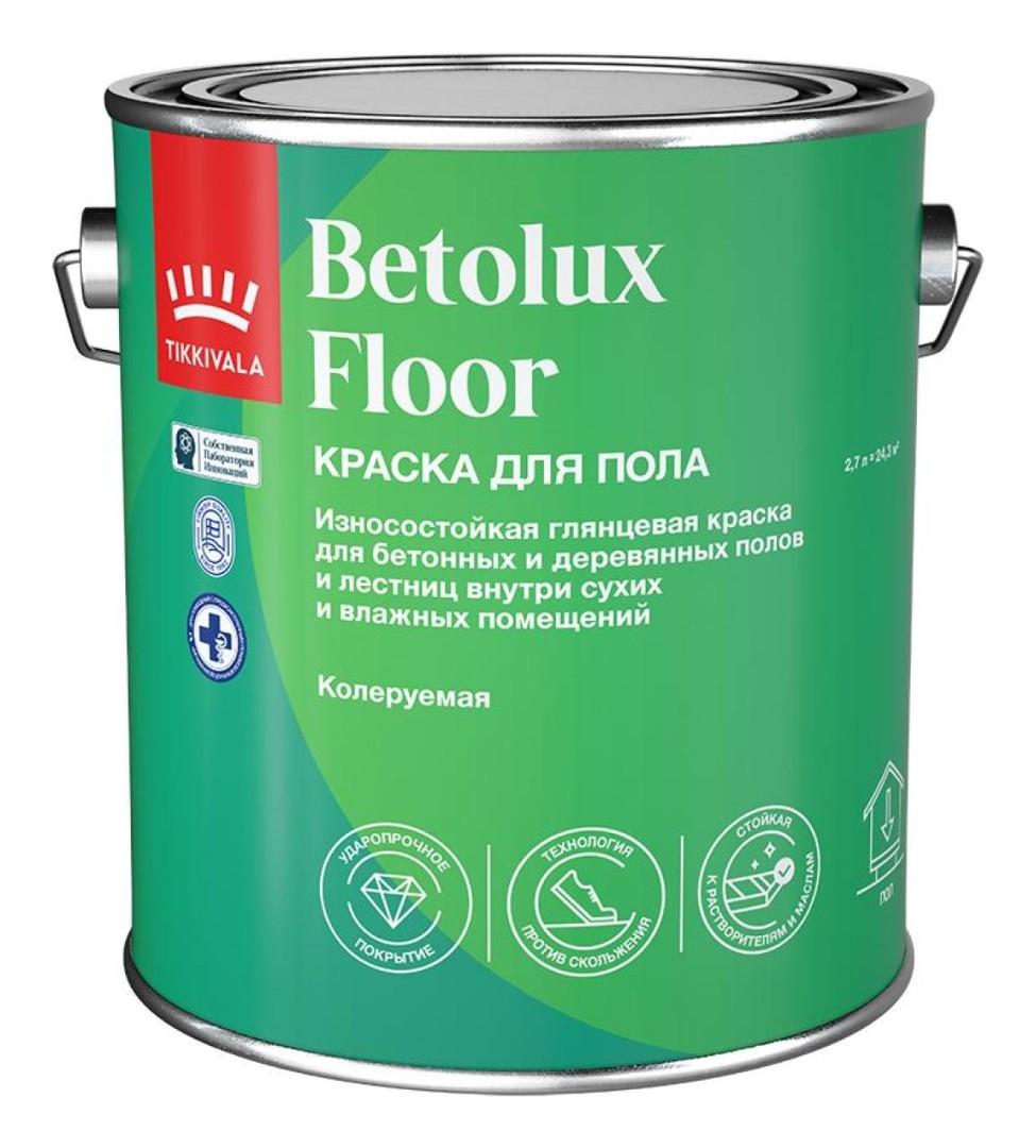 Износостойкая глянцевая краска TIKKIVALA BETOLUX FLOOR для бетонных и деревянных полов и лестниц внутри сухих и влажных помещений.