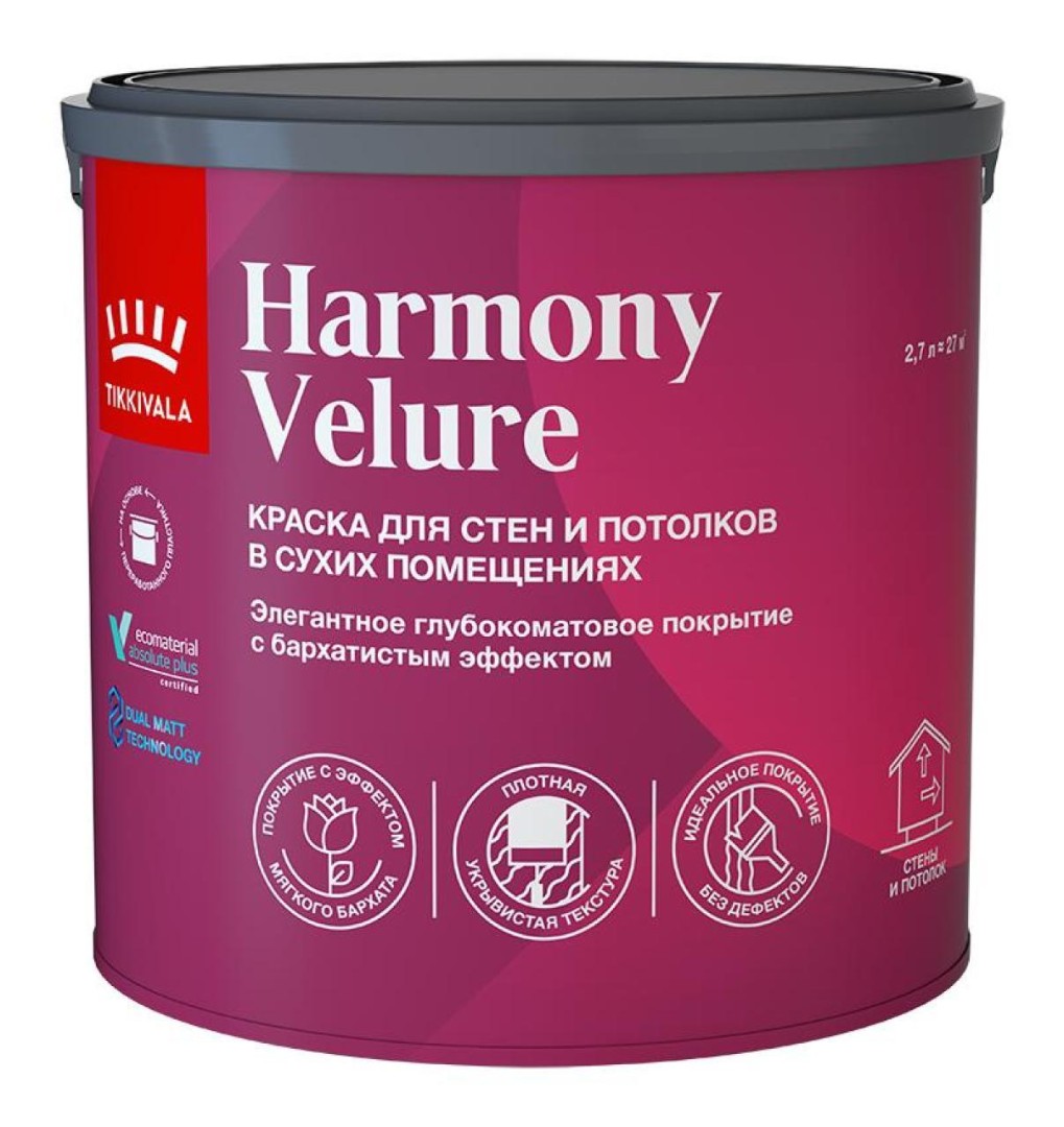 Краска для стен и потолков TIKKIVALA HARMONY VELURE в сухих помещениях. Создает элегантное глубокоматовое покрытие с бархатистым эффектом.