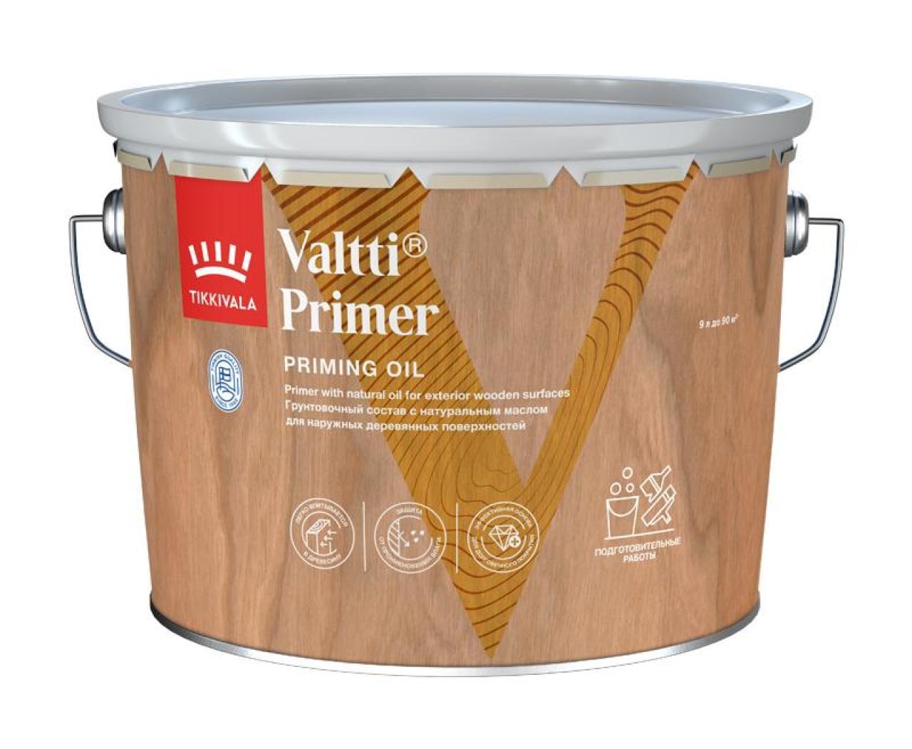 Бесцветный грунтовочный антисептик TIKKIVALA VALTTI PRIMER, содержащий масло, для обработки древесины снаружи.